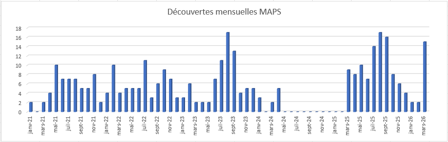 Bien que nous n'ayons utilisé deux télescopes que à partir de Mai 2021, MAPS a donc été le 4ème programme de recherche d'astéroïdes géocroiseurs en 2021, 2022 et 2023, évidemment bien loin derrière les programmes de Panstarrs et Catalina, mais qui utilisent des moyens techniques, humains et financiers légèrement supérieurs :).
